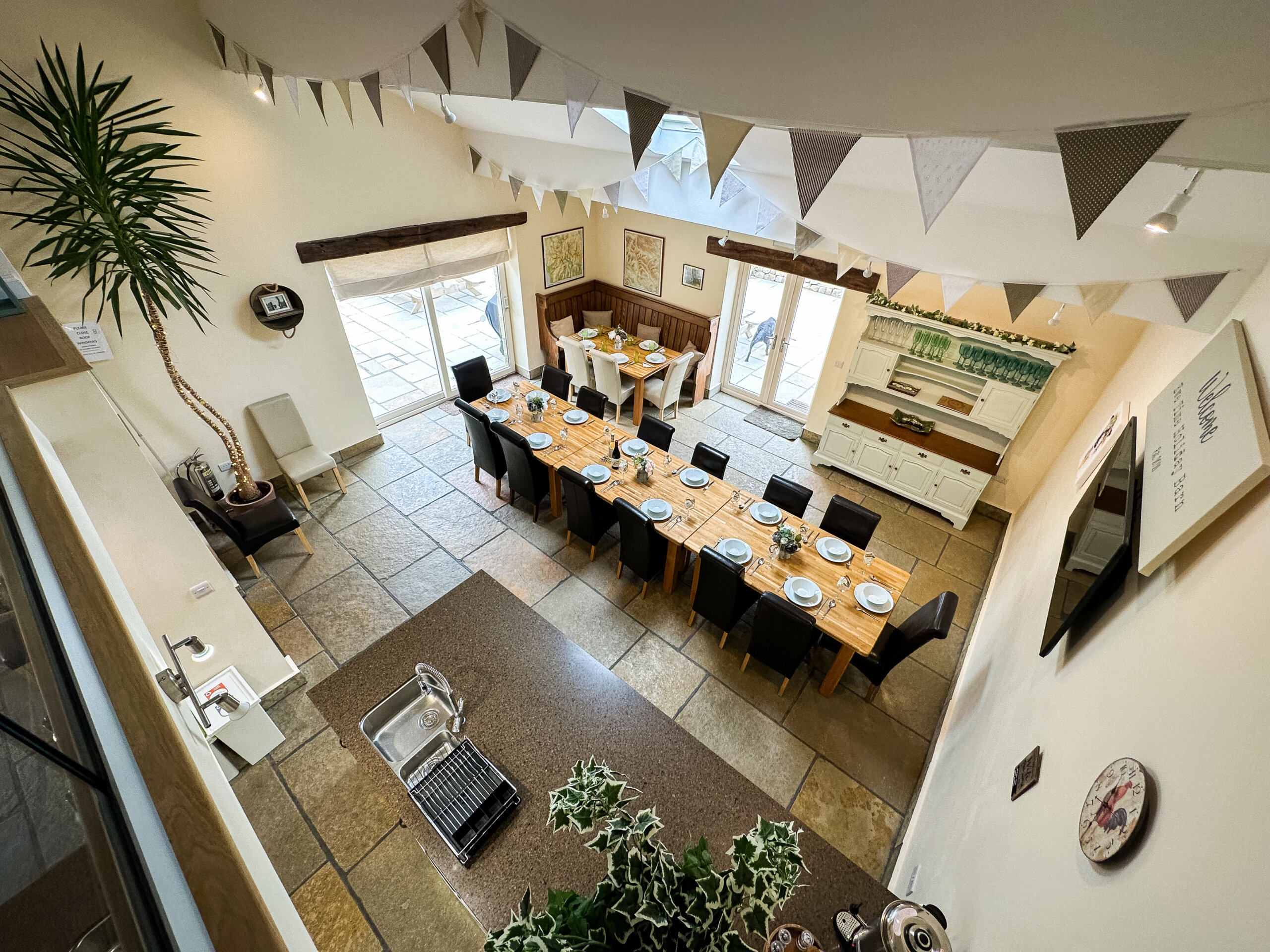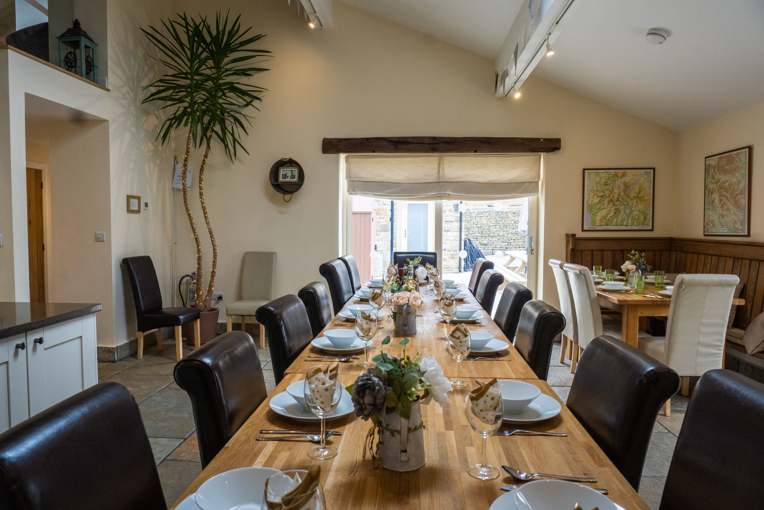Dining space for 24 with patio doors opening to the garden