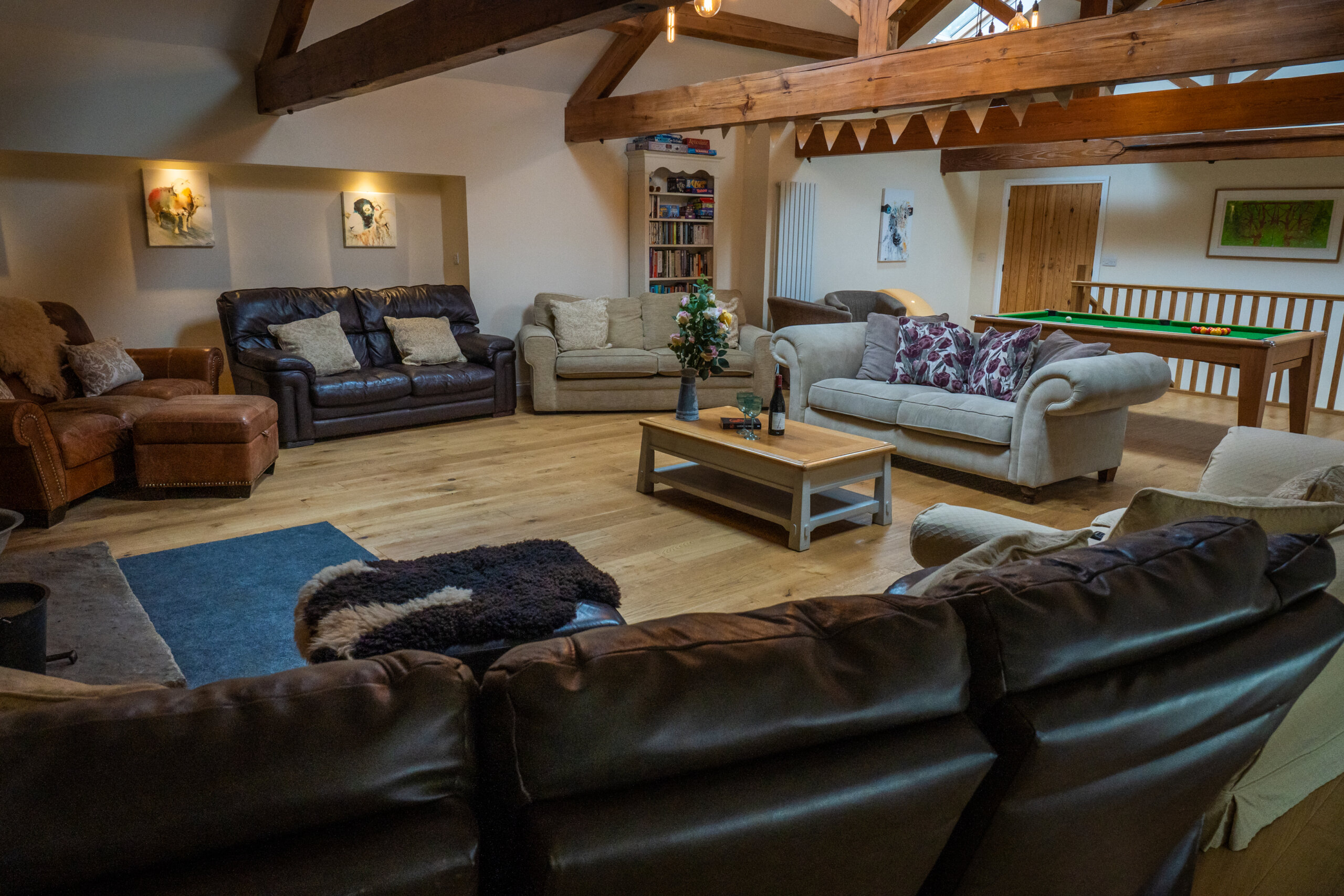 First-floor lounge with plenty of comfy sofas, wood burner, and games table for group fun